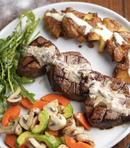 ۲۵۰ گرم فیله گوساله + ۳۰ گرم سیب زمینی +۱۰ گرم سس ایولی + ۷۰ گرم روکولا + ۱۰ گرم سس لیمو عسل +۸۰ گرم کدو + ۸۰ گرم سس قارج + ۵۰ گرم هویج