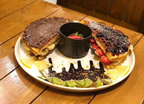 ۲۰۰ گرم وافل + ۲۰۰ گرم میوه های فصل مثل موز، سیب، هندوانه